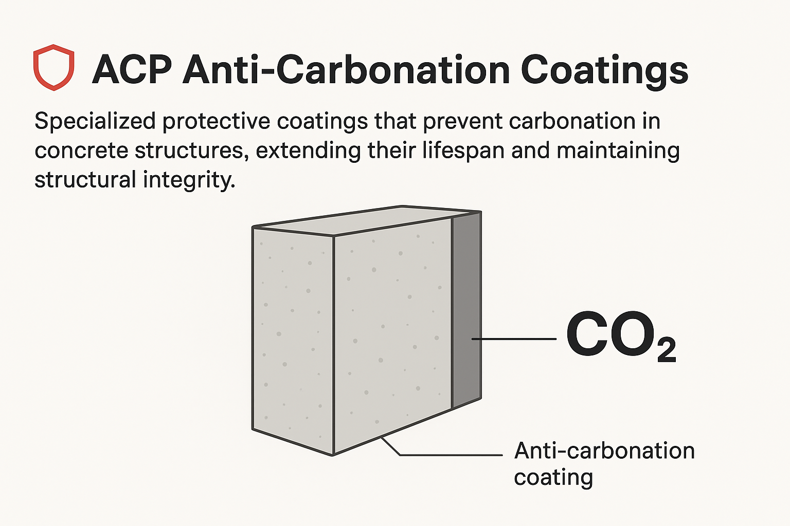 Specialized protective coatings that prevent carbonation in reinforced concrete, ensuring long-term durability and maintaining structural integrity. By blocking CO₂ ingress, they preserve the alkaline reserve and protect embedded steel reinforcement.